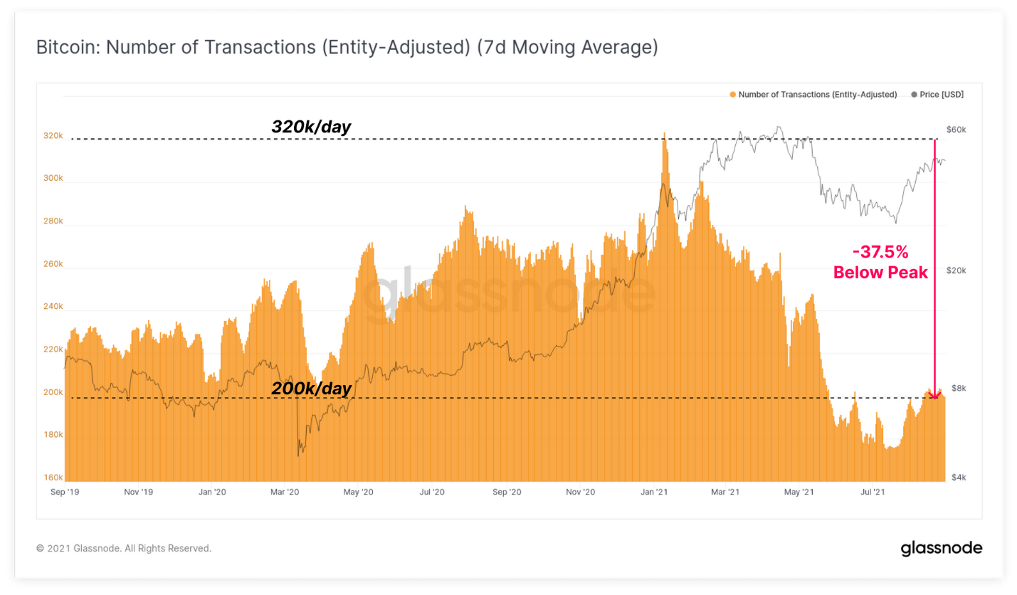 روند مشابهی برای تعداد تراکنشهای بیتکوین وجود دارد؛ که 37.5% پایینتر از قله ماه می است و در سطح 200 هزار تراکنش قرار دارد.